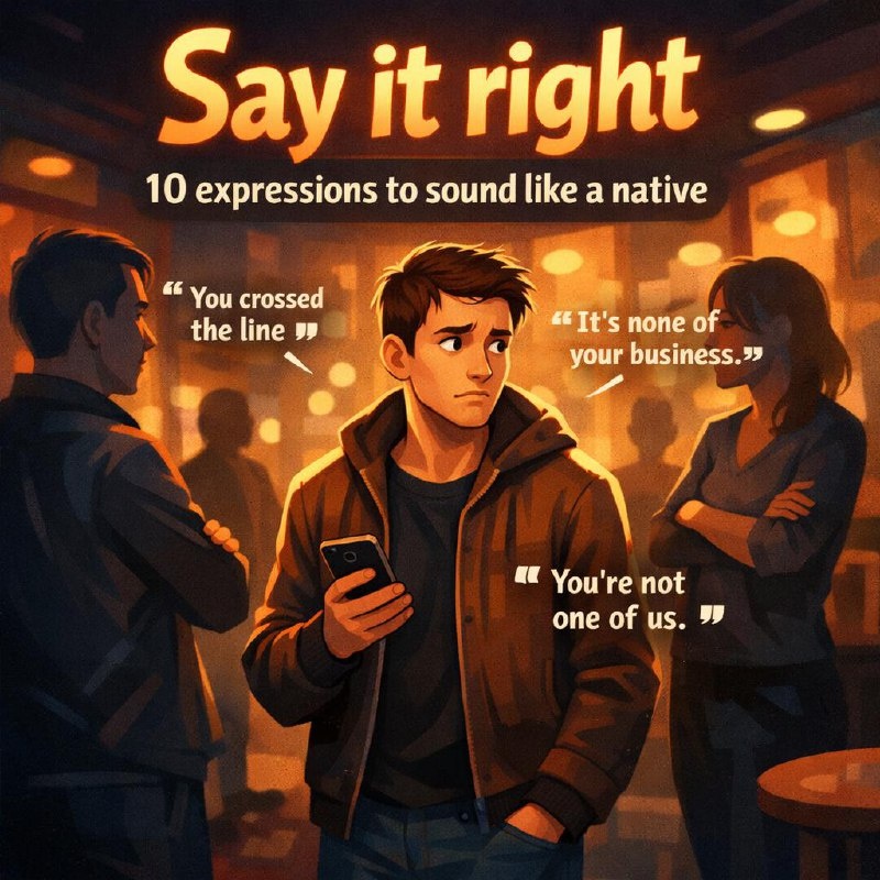 Фразы, которые добавят эмоций, характера и настоящего живого английского👇 1️⃣ You don’t belong here — Тебе здесь не место 📌 Используется, когда кто-то выглядит чужим, неуместным или нарушает границы. 🔸 “Go away. You don’t belong here.” 2️⃣ I’m not supposed to be here — Я вообще-то не должен здесь быть 📌 Означает, что человек оказался не там, где должен. 🔸 “I’m not supposed to be here, I was just passing by.” 3️⃣ You crossed the line — Ты перешёл черту 📌 Сказано, когда кто-то повёл себя недопустимо. 🔸 “That comment? You really crossed the line.” 4️⃣ It’s none of your business — Это не твоё дело 📌 Резко обозначает границы. 🔸 “Why are you asking? It’s none of your business.” 5️⃣ You’re way out of line — Ты вообще не в своём праве 📌 Сильное выражение, когда кто-то нагло нарушает нормы. 🔸 “You’re way out of line talking to her like that.” 6️⃣ You shouldn’t have come — Тебе не стоило приходить 📌 Часто встречается в фильмах и играх, звучит драматично. 🔸 “You shouldn’t have