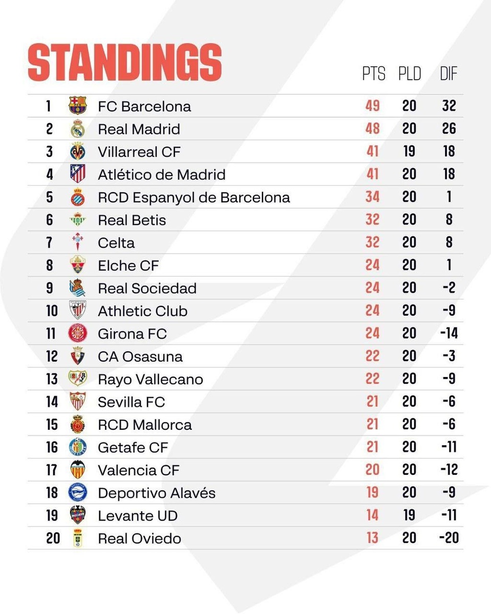 Турнирная таблица Испанской Ла Лиги.