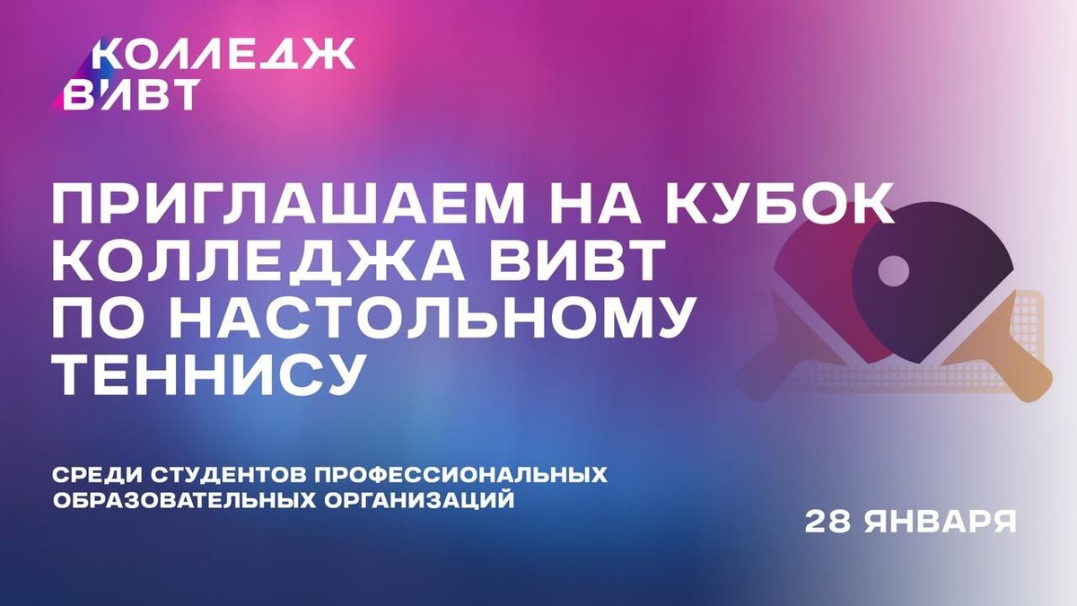 ! Приглашаем на ежегодный открытый турнир по настольному теннису среди студентов ПОО. В соревнованиях участвуют студенты колледжей. Состав команд – 3 человека: - 2 юноши (1-ая и 2-ая ракетка ) - 1 девушка - тренер-преподаватель (сопровождающий) Участникам соревнования при себе необходимо иметь спортивную одежду (спортивная обувь, футболка, шорты (допускаются спортивные штаны или леггинсы)). Учащиеся обязаны при себе иметь студенческие билеты или зачетные книжки. Встречаемся 28 января в 11.00, ул. Ленина, 73а. Подробности и подтверждение участия по почте: sk.vivt@mail.ru