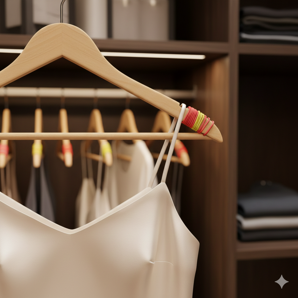 Что нужно сделать: Возьмите две обычные канцелярские резинки (или резинки для волос) и намотайте их на края вешалки (плечики) с обеих сторон. Достаточно сделать несколько оборотов, чтобы резинка плотно держалась на месте. Почему это работает: Резина обладает высоким коэффициентом трения. Она создает своеобразный «тормоз» для ткани. Даже самый скользкий шелк или атлас, коснувшись резинового барьера, перестает съезжать в сторону. Вещь остается надежно зафиксированной именно там, где вы её повесили. Лайфхак: Если нужно повесить платье на очень тонких бретельках, намотайте резинки чуть ближе к середине плечиков, создав небольшие «бугорки» — бретельки зацепятся за них и не соскользнут.
