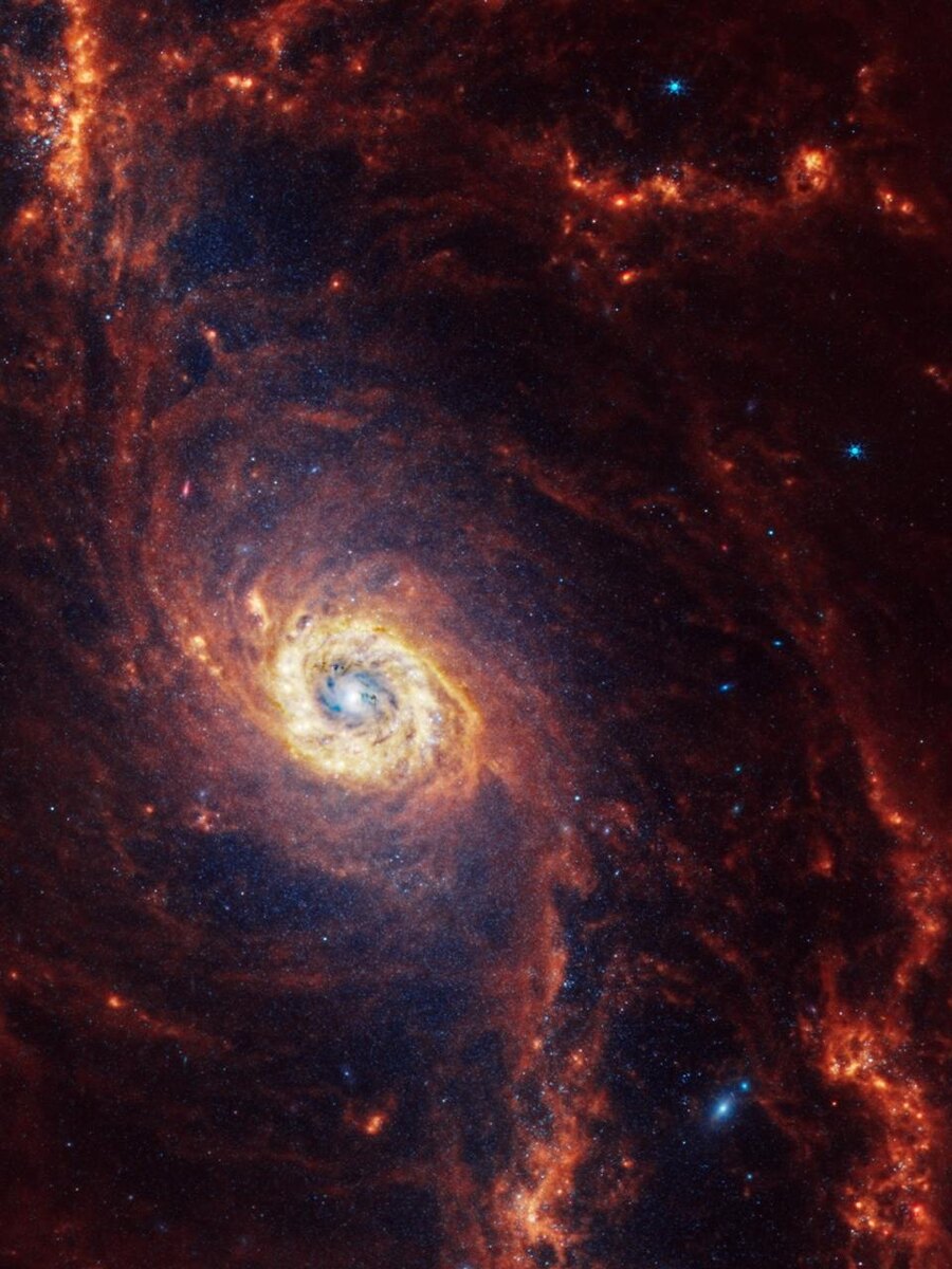 Снимок сделан телескопом Джеймс Уэбб (ESA), входя в новую коллекцию из 19 близких спиральных галактик с детальными портретами звезд, газа и пыли через пространство и время. Факт: бар в центре NGC 1672 питает звездообразование скоростью 10 солнечных масс в год, формируя асимметричные рукава по теории плотностных волн. Ближне- и среднеинфракрасные каналы Уэбба раскрывают миллионы голубовато-белых звезд, оранжевую пыль и яркие красные узлы рождения звезд. Эти слои отслеживают полный цикл жизни звезд — от коллапса в пылевых облаках до энергии, формирующей галактики. Факт: Seyfert-2 ядро галактики содержит черную дыру массой 10^7 солнечных, генерируя джеты мощностью 10^43 эрг/с. Факт: коллекция фиксирует эволюцию спиралей на z<0,02, показав пик активности 5 миллиардов лет назад.