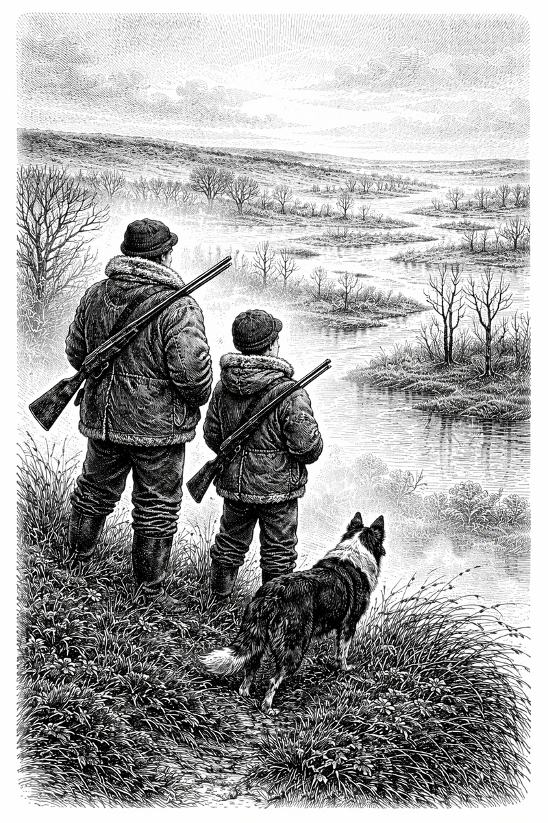 Джейк стоял на гребне возвышенности, оглядывая открывшуюся картину; дробовик был прижат к боку под рукой. Он был одет по погоде: в толстую овчинную куртку и тёплые штаны, охотничью шапку и чёрные забродные сапоги. Рядом стоял его сын Питер — четырнадцатилетний, точная копия отца, вплоть до ружья под рукой. Возле него был Бой, их восьмилетний бордер-колли: гладкая чёрная шерсть, острые глаза и уши, чутко улавливавшие любое движение.