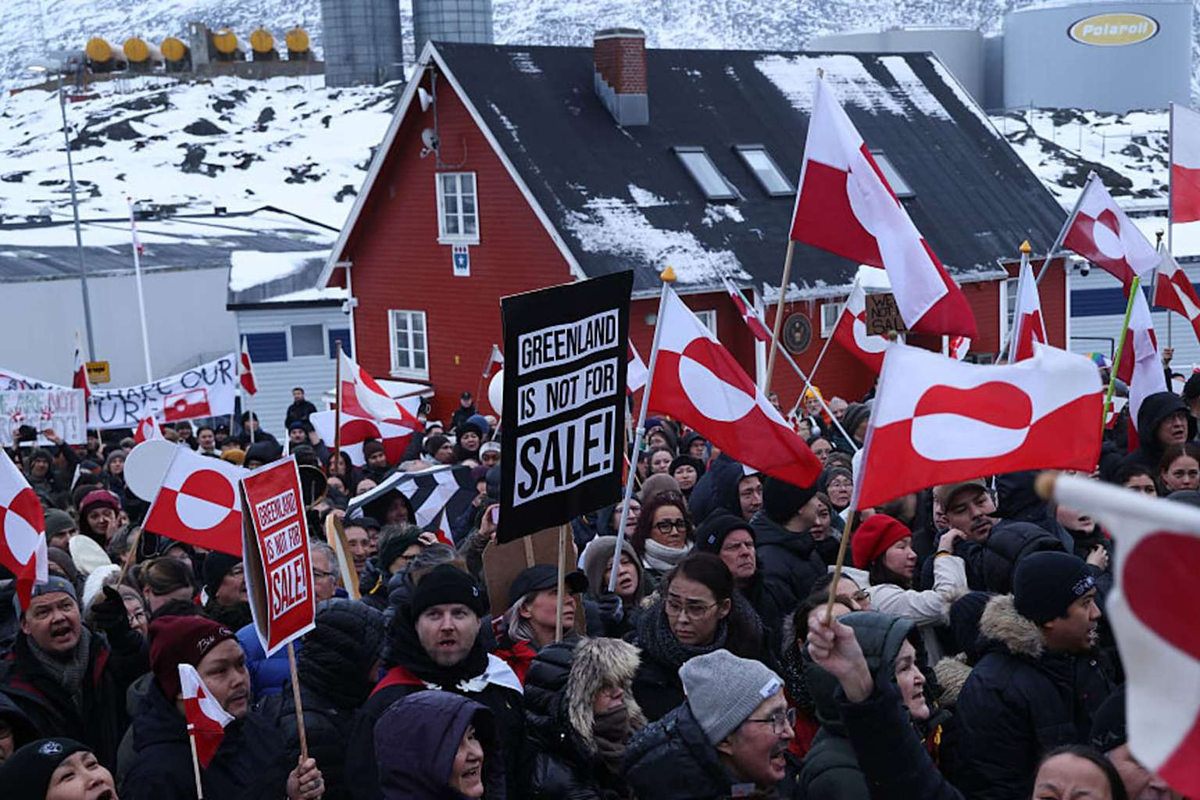 Сами гренландцы категорически против любых изменений статуса острова. Массовые митинги с лозунгами «Гренландия не продаётся!»(Greenland is not for sale!) показывают решимость местного населения отстаивать свою автономию. На фото — один из таких протестов: жители держат флаги Гренландии и плакаты с призывами сохранить независимость.