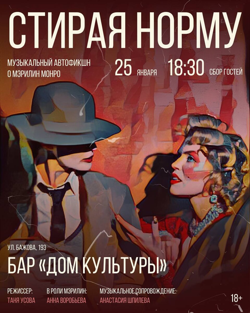 " ❤️🔥 Это история Мэрилин Монро, рассказанная от первого лица. Анна GRÈZA Воробьева - актриса, певица, педагог и основательница продюсерского центра «Музыкалка». Бэк-вокалистка группы Сергея Бобунца. Не довольствуясь очевидным внешним сходством с героиней Аня смело исследует ее внутренний мир и откроет нам как зрителям изнанку секс символа ХХ века. Мммм! Предвкушаю!!! 🔥🔥🔥 История Мэрилин до сих пор будоражит зрителей, сколько бы о ней ни было уже рассказано и написано… Этот спектакль — не полная биография, не повествование об истории успеха, не цельная драма. Это заметки на полях дневника, сделанные во время стремительного полёта кометы ☄️ Стихи, записанные от руки. Плёнки, отправленные в предпоследний день. Мысли, которые человек проживает наедине с собой. Рассказ о Норме (и норме), стирая день за днём на пути к мечте. Знаю, что авторы использовали фрагменты фильмов, дневники, воспоминания современников и редкие материалы, чтобы создать образ Монро за пределами киноэкрана �