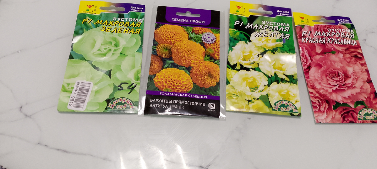 Вот такие семена приобрела . Здесь эустома и бархатцы Антигуа . Для бархатцев конечно ещё не время, а эустому надо садить. Прошлый год я посадила не в марте и было позднее цветение, август-сентябрь. В этом году решила посадить