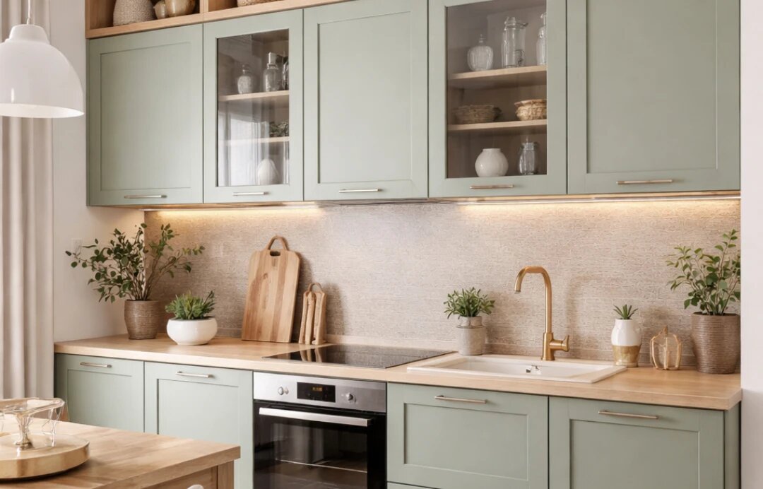 Более практично — системы tip-on или открывание нажатием. Такой механизм позволяет отказаться от видимых ручек, сохранить чистые линии фасада, а интерьер сделать визуально легче. В результате верхний ряд выглядит как единая аккуратная секция, а кухня — более сбалансированной.