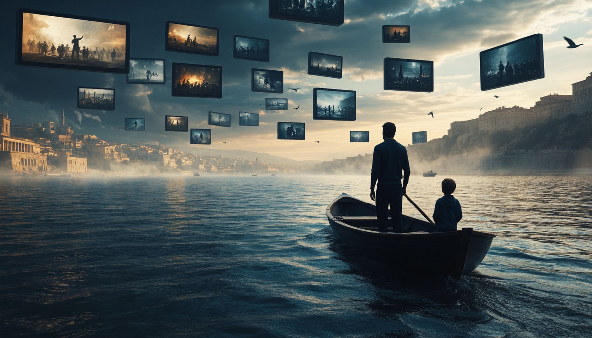 Новый арт эксперимент – серия изображений, где реальность переплетается с воспоминаниями или сновидениями. В центре композиции — лодка, плывущая по реке. В лодке двое: взрослый мужчина и ребёнок. Их позы спокойны, но в них чувствуется некая отстранённость, будто они путешествуют не только по воде, но и сквозь время. Берега реки, по которой они плывут, меняются от изображению к изображению: то это золотистые степи с пологими холмами, то пейзажи древних и современных городов. Пейзаж наполнен мягким светом заката, что придаёт изображениям одновременно и теплоту, и лёгкую меланхолию, создавая ощущение бесконечности и зыбкости границы между реальностью и фантазией. Над лодкой и рекой парят многочисленные фотографии в рамках, словно подвешенные на невидимых нитях. На снимках — разные люди, сцены, моменты жизни: кто-то в военной форме, кто-то в деловых костюмах, кто-то запечатлён в моменты раздумий или действия. Эти изображения словно воспоминания, создающие над путниками «облако памяти». Они