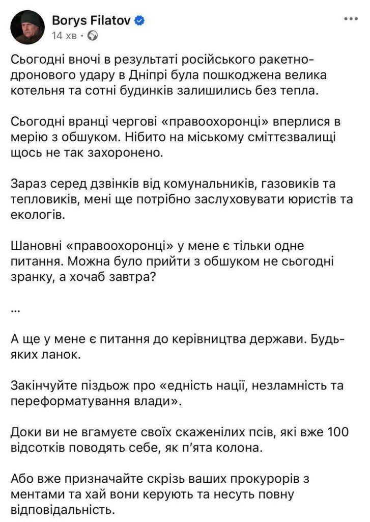 Утром в здание мэрии Днепропетровска прибыли правоохранители с обысками, связанными с проверкой якобы нарушений на городском мусорном полигоне. Об этом сообщил мэр города Борис Филатов. По словам Филатова, силовики проверяют «что-то ли не так захоронено», не уточнив подробностей. Мэр резко отреагировал на действия силовиков: «А ещё у меня есть вопрос к руководству государства. Любых звеньев. Заканчивайте подлизывание про «единство нации, несгибаемость и переформатирование власти». Пока вы не угомоните своих бешеных псов, которые уже на 100% ведут себя как пятая колонна. Или уже назначайте повсюду своих прокуроров с ментами и пусть они руководят и несут полную ответственность», — написал он. Ранее мы сообщали о возможной подготовке подозрения в отношении мэра Днепропетровска.