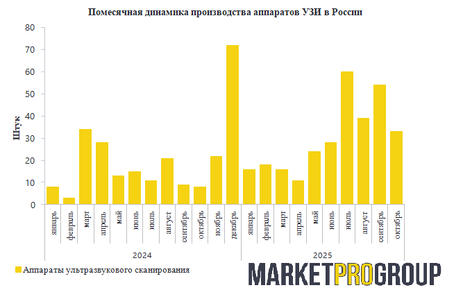 Открытие новых производств и наращивание мощностей в последние годы во многом стало результатом реализации национального проекта «Здравоохранение» и курса на импортозамещение в медицинской промышленности. Согласно данным исследования «Анализ рынка аппаратов УЗИ в России в 2025 году» компании MarketProGroup, за 10 месяцев 2025 года в стране было выпущено почти три сотни аппаратов ультразвукового сканирования, что вдвое превысило уровень аналогичного периода предыдущего года. По нашим оценкам, совокупно за 2025 год производство УЗИ-аппаратов в стране может приблизиться к значению в 500 штук, в то время как в 2024 году он составлял 244 аппарата. Последние несколько лет российская медицинская промышленность на фоне санкций переживает период интенсивной трансформации, и сегмент ультразвукового диагностического оборудования – один из самых ярких примеров. Еще несколько лет назад рынок был практически полностью зависим от импорта, однако к 2025 году ситуация существенно изменилась. Запуск пол