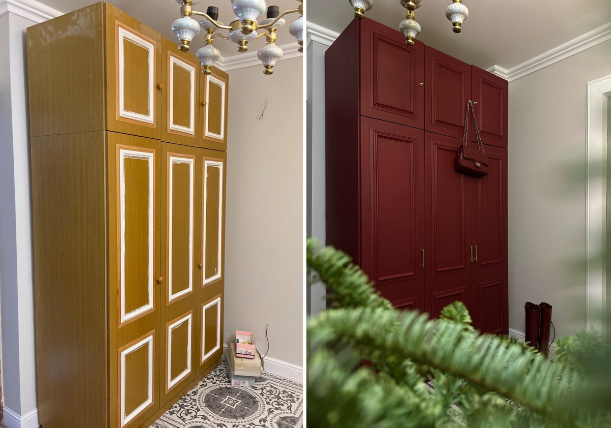 Хозяйка этого роскошного шкафа — Александра Балакина, маркетолог из Оренбурга. Однажды она увидела на сайте объявлений невзрачный шкаф в стиле 90-х годов. И сразу поняла, что он идеально впишется в ее стильную прихожую. Только нужно кое-что переделать.
