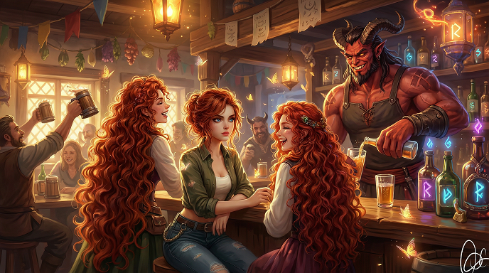 Он то и дело исчезал в клубах дыма и появлялся в другом конце стойки, строя рожицы бармену. Его в шутку пытались поймать двое леших - братьев, судя по переплетенным ветвям в их волосах и одинаковым узорам на коже. От них пахло мхом, хвоей и чем-то терпким, будто дикий мед.