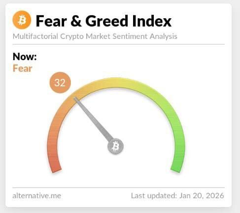 ИНДЕКС СТРАХА И ЖАДНОСТИ В КРИПТОВАЛЮТАХ только что упал до 32, по сравнению с 44 вчера.