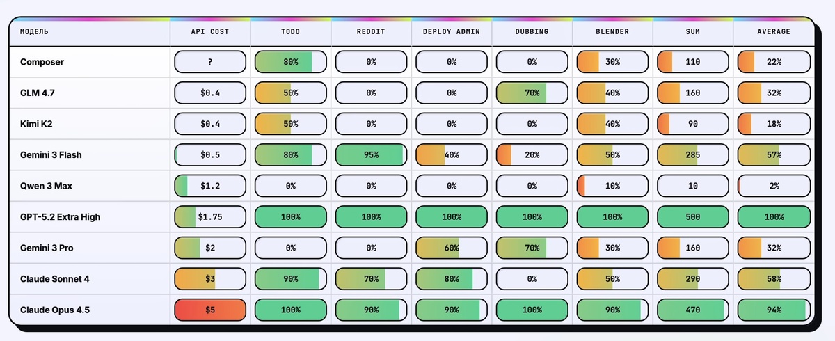 На канале 📱 Олега Стефанова вышел новый ролик где он комплексно сравнивает каждую модель на равных условиях в разных задачах. Результат вполне объективный, и, самое главное, полностью совпадает с моим топом, который последний месяц жестко зафиксировался и ставит GPT 5.2 в безоговорочные лидеры. Топ моделей: 👑 GPT‑5.2 Extra High 2️⃣ Claude Code Opus 4.5 3️⃣ Claude Code Sonnet 4.5 (на скрине очепятка) 4️⃣ Gemini 3 Flash 5️⃣ Gemini 3 Pro 6️⃣ GLM 4.7 7️⃣ Composer 8️⃣ Kimi K2 9️⃣ Qwen 3 Max Самое важное часто упускается, когда мы сравниваем GPT и Claude Code, а это количество денежных средств, затраченных на решение проблемы. Токены считать смысла нет без привязки к тарифам. Так что 1,75$ у GPT против 5$ у Opus является жирной точкой в сравнении данных моделей. Конечно, выборка для теста смешная, но даже тех примеров, что были на видео, с головой достаточно, чтобы выявить слабые и сильные стороны каждой модели, я уверяю. То, что GPT метит в топы, было ясно еще с 5.1 версии, уже тогда