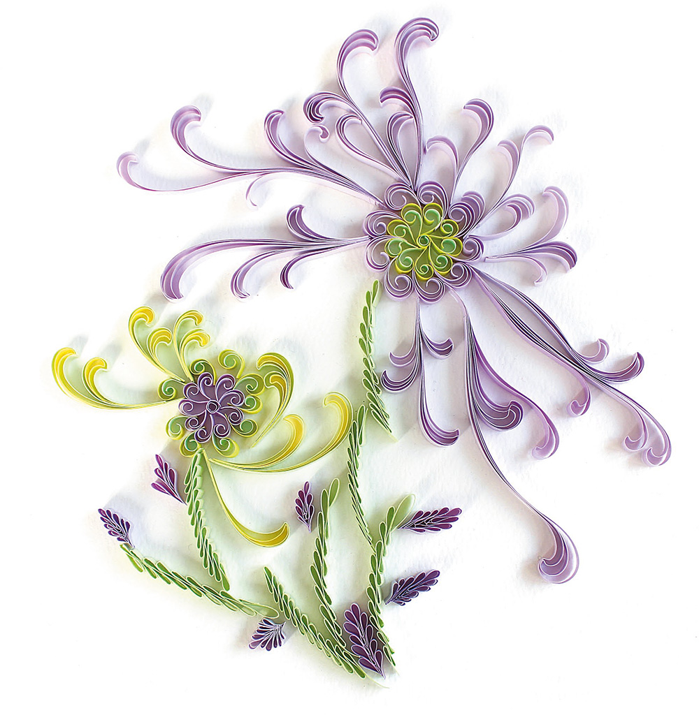 Наши статьи о квиллинге здесь. Друзья, сегодня мы хотим рассказать о том, как превратить простые полоски бумаги в нежные, почти живые хризантемы. Эти цветы идеально украсят открытку или подарочную упаковку — они создают ощущение праздника и тепла. Хризантемы цветут, когда другие растения уже спят под снегом, поэтому в Китае их называют одним из «Четырёх благородных» вместе с сливой, орхидеей и бамбуком — символом стойкости, чистоты и изысканности. Поэты веками воспевали их красоту, например, строки о сборе хризантем под восточной изгородью и любование южными холмами до сих пор трогают сердце. Мы используем базовые завитки и петли, чтобы передать пушистые лепестки и грациозные стебли — получается аккуратно, нежно и очень утончённо. Делаем два цветка — одинаковые по форме, но с разными оттенками. • Фиолетовая и зелёная бумага для полосок (для сердцевины) — (готовая из наборов для квиллинга, или цветная бумага для творчества / офисная)