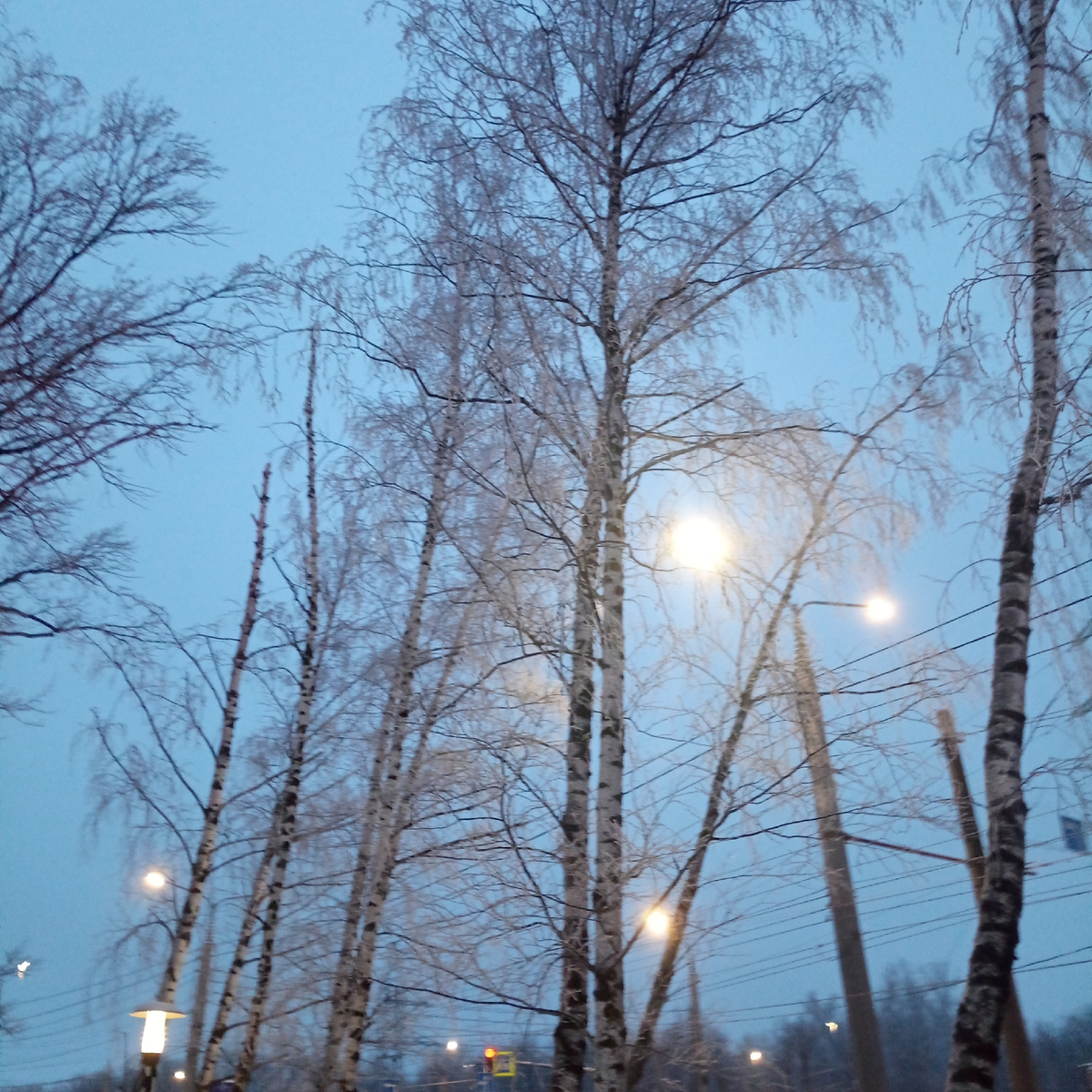 Приехали на место раньше времени. На улице ещё фонари не выключили.