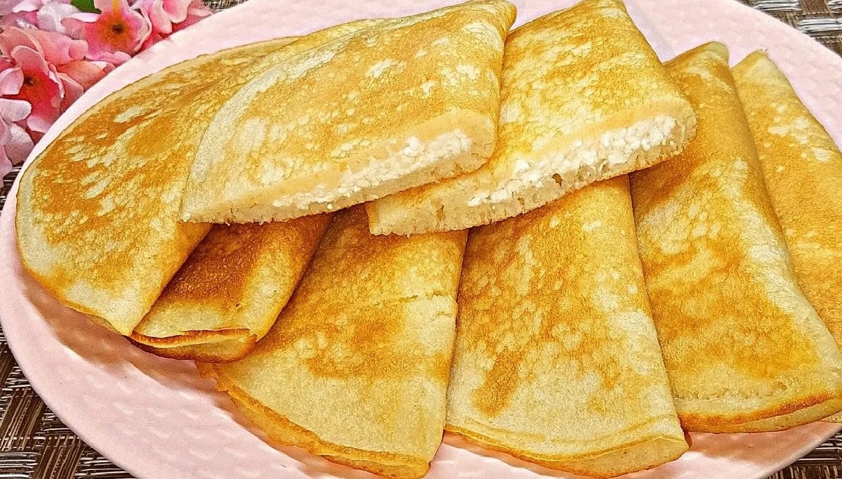 Быстрый завтрак блинчики на кефире с начинкой или просто на перекус. Нежные, ароматные и сытные. Очень просто и быстро готовятся.