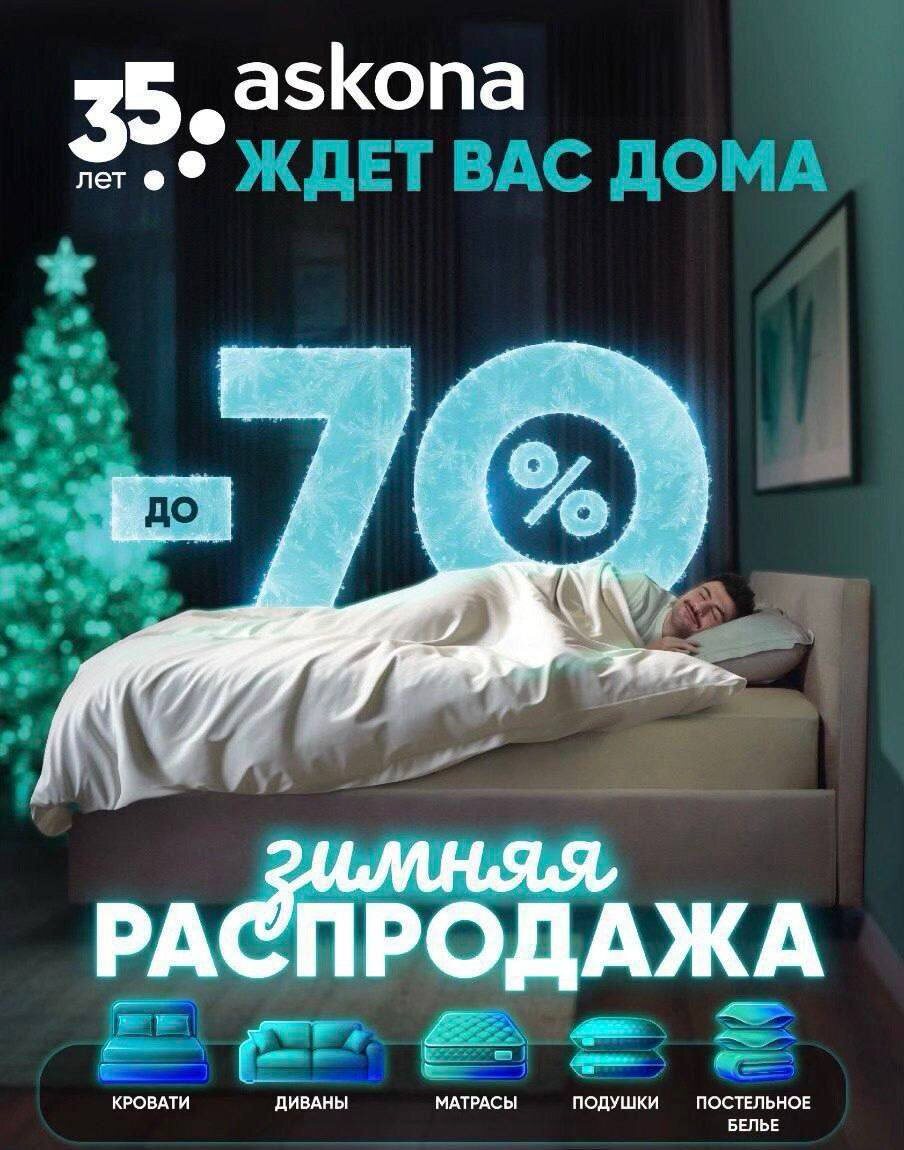 !❄️🌟 ❗️ Срок акции: с 20.01.2026 по 25.01.2026 года • МАТРАСЫ со скидками до -70% • КРОВАТИ со скидками до -50% • ДИВАНЫ со скидками до -50% • ПОДУШКИ со скидками до -45% • ПОСТЕЛЬНОЕ БЕЛЬЁ со скидками до -50% 💥 Ждём вас за покупками этой зимой! Количество товаров по акции ограничено, поэтому спешите посетить магазины Аскона Крым! Для получения подробной информации об акции обращайтесь к менеджерам в наших салонах. ТГ канал https://t.me/askona_crimea 📌 Мы ждем вас в наших магазинах: 📌г. Севастополь, ТЦ "Капитан", 1 этаж +7(978)574-2700 Реклама. ИП Иванова О.Ю. ИНН: 752501554276.