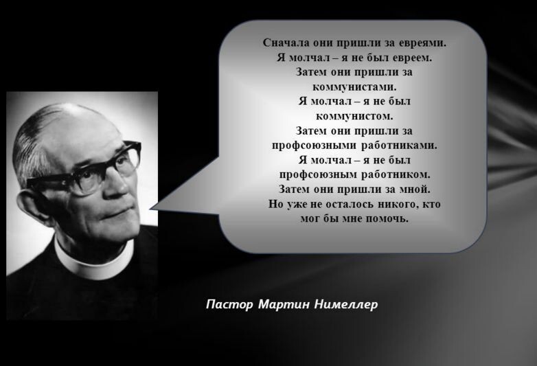 Давно хотел понять контекст следующей цитаты: «Когда они пришли за коммунистами, я промолчал, потому что я не был коммунистом. Когда они пришли за социал—демократами, я промолчал, потому что я не был социал-демократом. Когда они пришли за профсоюзными деятелями, я промолчал, потому что не был членом профсоюза. А когда они пришли за мной, не осталось никого, кто мог бы вступиться за меня». Если вам тоже интересно, давайте поисследуем вместе … Эта знаменитая цитата, принадлежит Мартину Нимеллеру (1892–1984), немецкому протестантскому теологу и пастору, ставшему одним из самых известных символов личной ответственности и сопротивления нацизму. В первые годы нацистского режима он изначально поддерживал Гитлера, но быстро разочаровался, когда нацисты начали вмешиваться в дела церкви и преследовать людей по политическим и расовым мотивам. Он стал одним из основателей Исповедующей Церкви, которая противостояла нацификации немецкого протестантизма. Эта цитата является аллегорией постепенного ущ