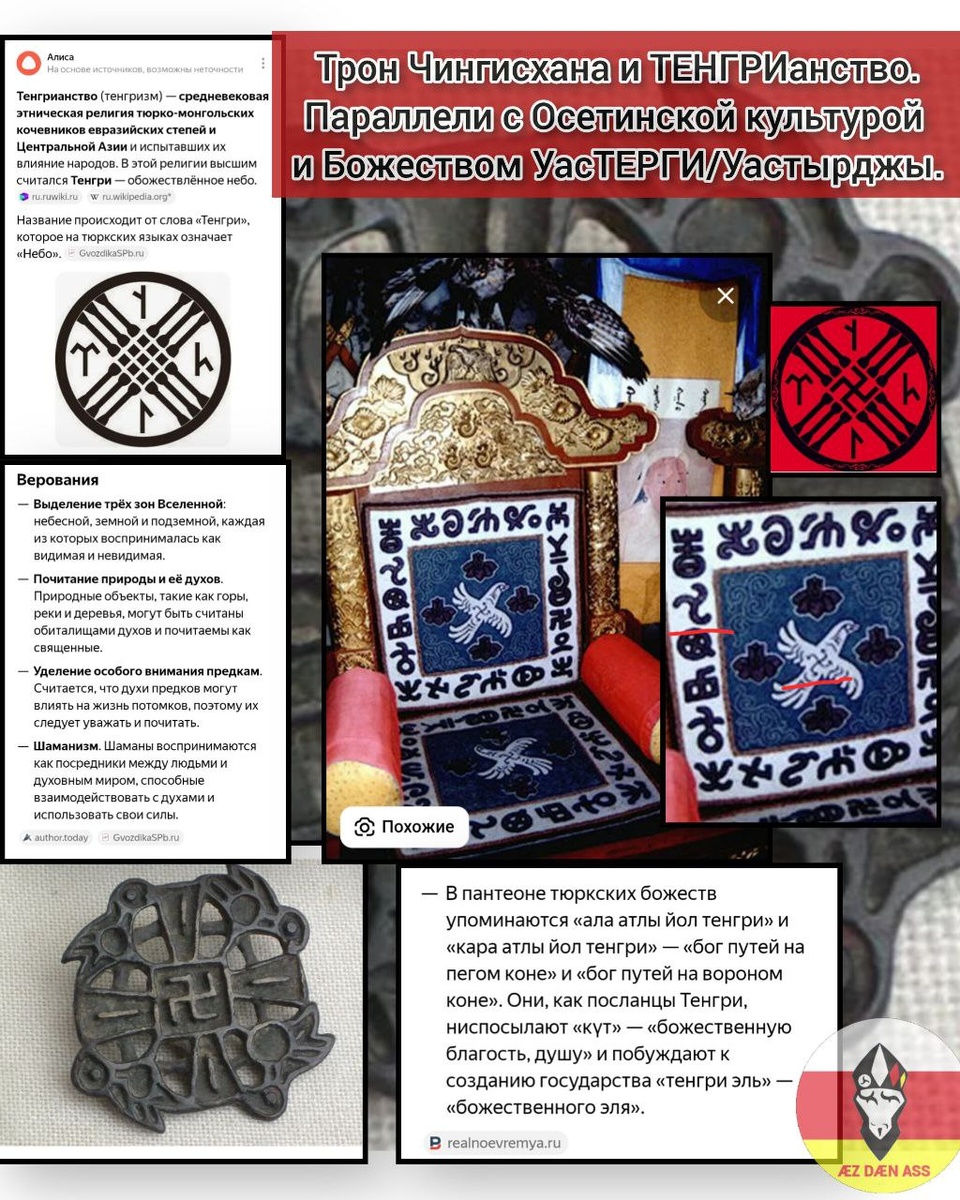 Параллели с Осетинской культурой и УасТЕРГИ/УаСТЫРДЖЫ. Символы и верования очень схожи и по сути. Есть версия, что сам Чингисхан и его род был Аланским и по сути, получается, что мы друг против друга воевали. Не просто так, у Чингисхана элитными войнами были Асуты-Аланы☝️ По этому вопросу посмотрите лекции Залины Джиоевой, вот одна из них 👉 https://youtu.be/UFOB6_Cgwog?si=XHUTJVag252Z6xeL