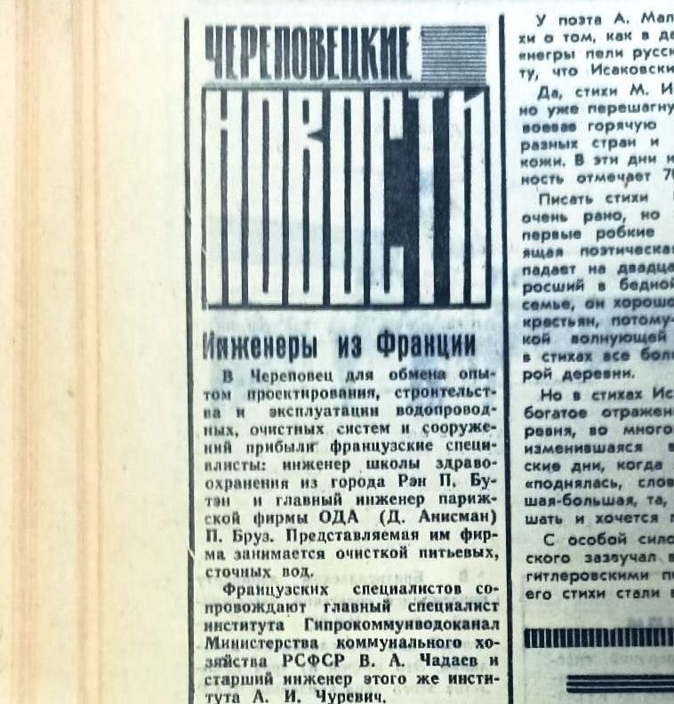 20 января 1970 года в Череповец для обмена опытом проектирования, строительства и эксплуатации водопроводных, очистительных систем и сооружений прибыли французские специалисты. Гостей из Франции принял заместитель председателя горисполкома Н.В. Ератин. Он ознакомил их с историей Череповца, коммунальным хозяйством, коротко рассказал о перспективах развития города. Французские специалисты задали ряд вопросов. Они интересовались, из каких источников составляется городской бюджет, кто финансирует строительство очистных сооружений и… как избирается мэр города. На все вопросы даны исчерпывающие ответы. В течение двух дней гости из Франции будут вести детальное ознакомление с производственной базой и сооружениями управления «Водоканал». Сегодня их визит заканчивается. Из Череповца французские специалисты выедут в Ярославль.