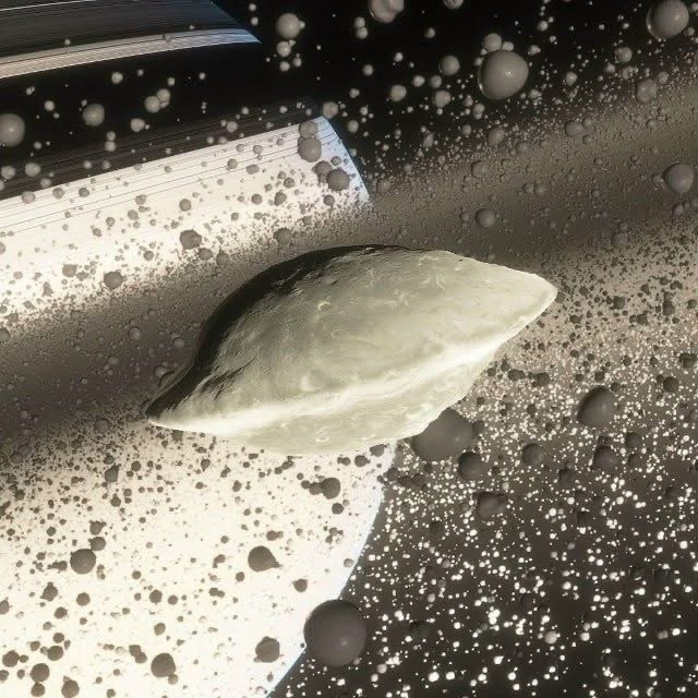 Рисунок одной из карликовых лун Сатурна, вращающейся между кольцами Сатурна 🔭