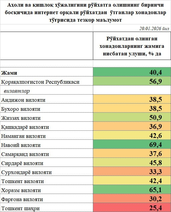 Жадвалга кўра энг яхши натижа кўрсатган ҳудудлар: ▪️Навоий вилояти; ▪️Хоразм вилояти; ▪️Қорақалпоғистон Республикаси; ▪️Жиззах вилояти. Охирги ўринлардаги ҳудудлар: ▪️Қашқадарё вилояти; ▪️Сурхондарё вилояти; ▪️Фарғона вилояти; ▪️Тошкент шахри. Каналимизга обуна бўлинг ва энг сўнгги янгиликларни кузатиб боринг Jizzaxnews |Тelegram | Facebook | Dzen | YouTubе