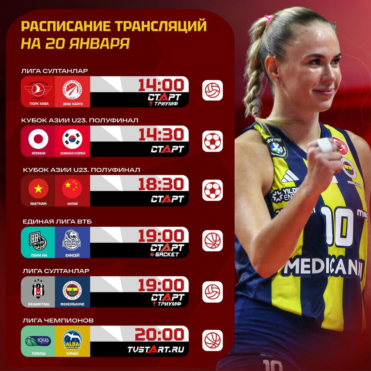 ! Сегодня узнаем финалистов молодежного Кубка Азии, посмотрим стамбульское дерби в Лиге Султанлар, а также начнем второй групповой этап баскетбольной Лиги Чемпионов. Также не забываем и про волейбольную. Оставайтесь весь день на телеканалах «Старт» и платформе TVSTART.RU 🖥 🛒 Наше приложение в Google Play 💙 Наше приложение в RuStore 🛒 Наше приложение в App Store