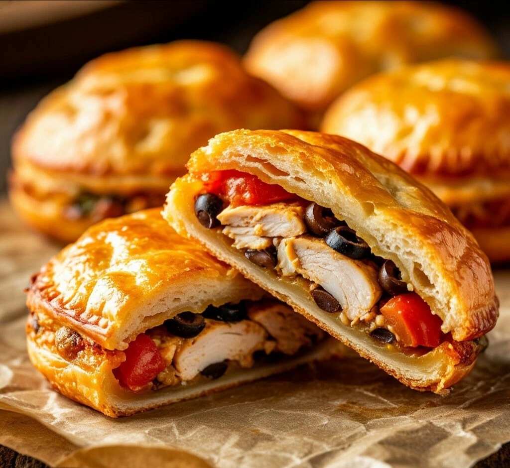 2. 🍗 Начинка: Куриное филе мелко нарезать. Обжарить на сковороде с луком до готовности. Добавить мелко нарезанные помидор и оливки, томатную пасту, орегано. Влить бульон и тушить 7-10 минут, пока соус не загустеет. Остудить.