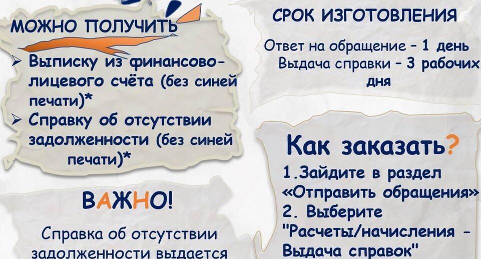 Выписку из финансово-лицевого счета и справку об отсутствии задолженности клиенты МосОблЕИРЦ могут заказать и получить, не посещая офис, передает пресс-служба корпоративных коммуникаций МосОблЕИРЦ. Как заказать справку онлайн • В личном кабинете на сайте мособлеирц.рф или в приложении «МосОблЕИРЦ Онлайн» выберите «Отправить обращение» — «Расчеты и начисления» — «Выдача справок» • Укажите тип справки и оправьте заявку • При необходимости приложите фото документов. В разделе «Консультация по выдаче справок» можно уточнить, какие документы понадобятся для получения справки по вашему адресу. Ответ на обращение составляет 1 день. Выдача справок — 3 рабочих дня. Справка об отсутствии задолженности предоставляется через 3-5 дней после полной оплаты ЖКУ. Получать справки могут только собственники и зарегистрированные жильцы. Документы, заверенные синей печатью, можно заказать онлайн и получить через три дня в офисе МосОблЕИРЦ. При необходимости получить справку в день обращения можно на плат