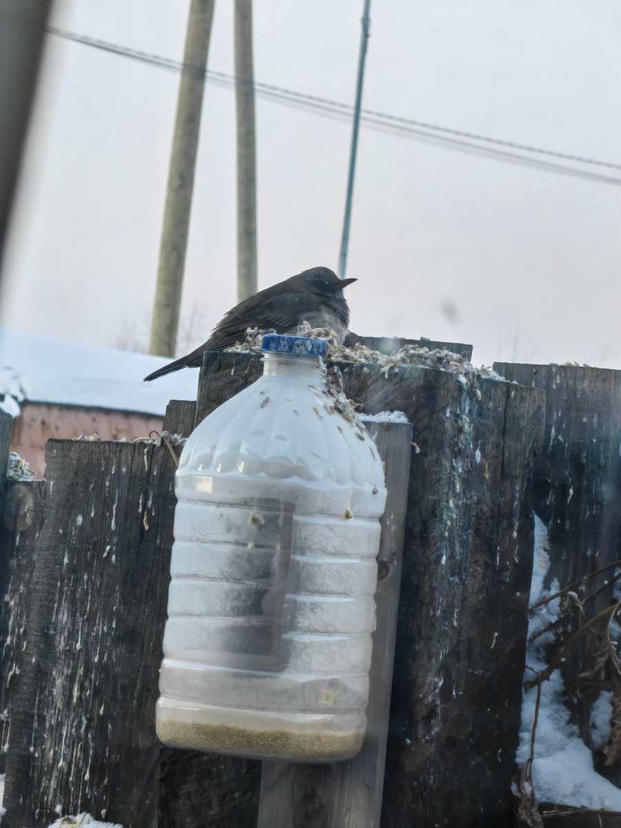 Запулила фото в чат родственникам, пусть развлекаются. Искали по всем источникам. Пересмотрели много вариантов. Сын сделал предположение, что это дрозд. Вроде как похоже.