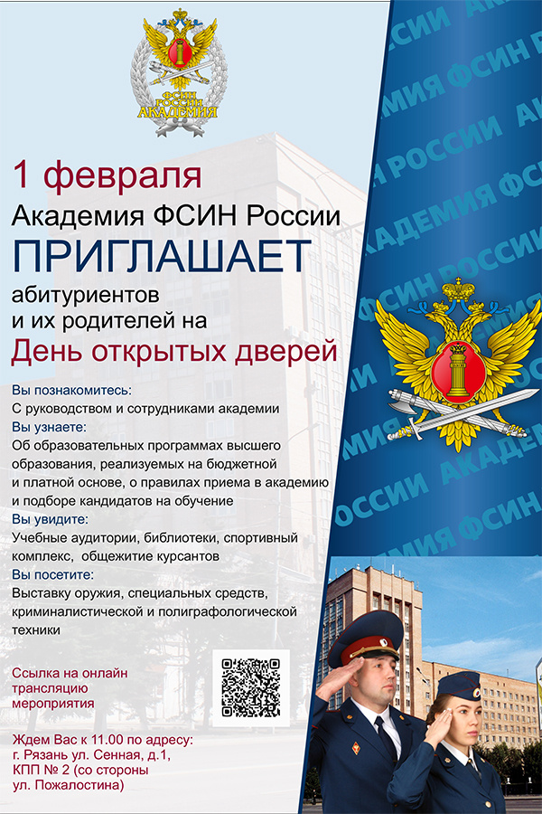 1 февраля в Академии ФСИН России состоится День открытых дверей. Ждем абитуриентов и их родителей в 11:00 по адресу: ул. Сенная, д. 1. КПП № 2 (со стороны ул. Пожалостина). В рамках Дня открытых дверей состоится встреча с руководством академии, на которой вы сможете получить исчерпывающую информацию об основных образовательных программах высшего образования, реализуемых академией за счет средств федерального бюджета и на платной основе, а также о правилах приема в академию и особенностях подбора кандидатов на обучение. Те, кто по разным причинам не сможет посетить академию лично, получат возможность задать свои вопросы руководству вуза онлайн. Лучше познакомиться с учебно-материальной базой и основными направлениями деятельности учреждений и органов уголовно-исполнительной системы поможет посещение учебных аудиторий, библиотеки, спортивного комплекса и мест проживания курсантов. Будут организованы выставки оружия, специальных средств, криминалистической и полиграфологической техники.