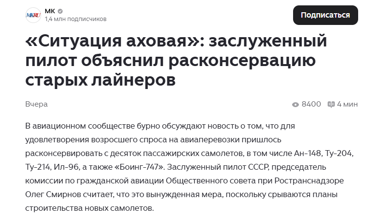 Член Общественного совета Ространснадзора Олег Смирнов о расконсервации старых лайнеров. МК, 19.01.2026