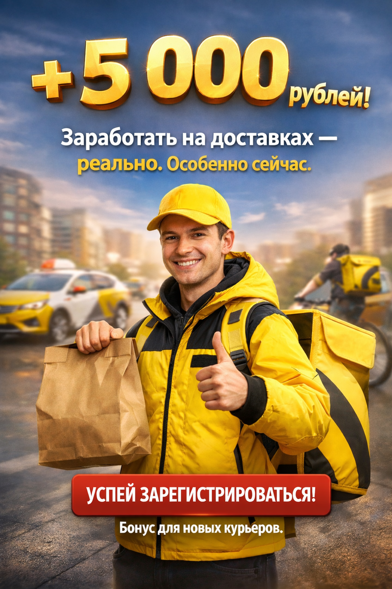 Работа курьером в Яндекс Доставке — это не просто свободный график и доход каждый день. Сейчас — это еще и особая выгода для новых курьеров. Пройдите регистрацию по нашей ссылке и выполните первые 100 заказов за 20 дней. В награду за активный старт вы получите дополнительные 5 000 рублей к своему заработку. Что это дает? Это отличный шанс начать с бонусом, обкатать маршруты и убедиться в стабильности заработка. Подходит как для подработки, так и для основного дохода. Специальное предложение ограничено — успевайте начать! 💡 Хотите быть в курсе всех лучших предложений?