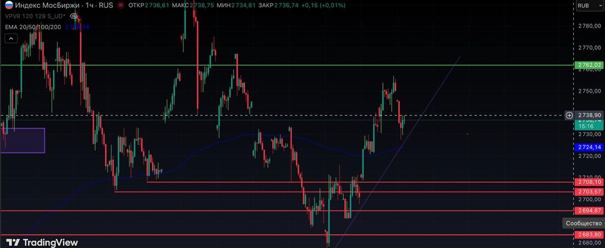 Ушли под 2700, что дальше? 🏦 Индекс МосБиржи не смог пробить сопротивление 2750п и ушел вниз. Сейчас торгуеимся на уровне 2736п и уже подходим к трендовой наклонной. Сейчас важно не уйти под 2720п, это ключевое сопротивление, проход которого сломает тренд в шорт. На этом уровне проходит и ЕМА200 и наклонная Смотрю на лонг по #SIBN ⛽️ от уровня 488 руб, но возьму только на позитивных новостях или пробитии 2750п!