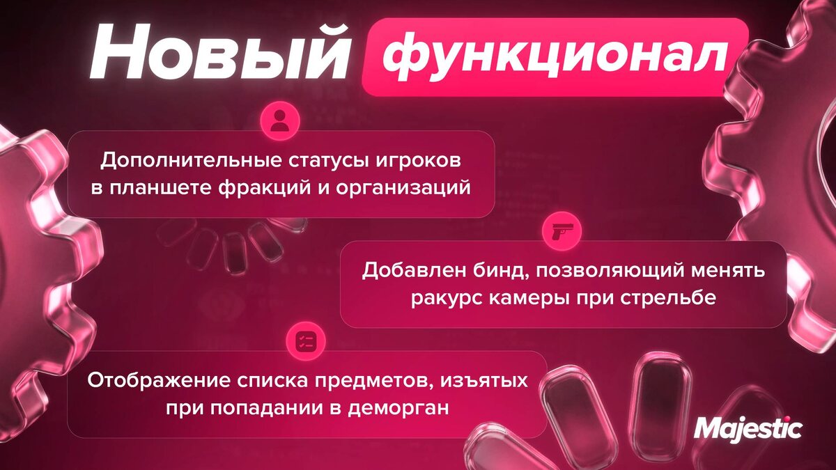 Утренний рестарт — и сразу несколько заметных улучшений в повседневных механиках: • планшет фракций и семей: добавлены точные статусы онлайна игроков; • добавлен бинд для смены ракурса камеры во время стрельбы (левое плечо): в меню F2 >> настройки >> назначение клавиш; • список изъятых предметов: если при попадании в деморган у вас были изъяты предметы, вы увидите их список. 👉Полный список изменений за 20 января — по ссылке. ❤️ Majestic Role Play | Change Logs