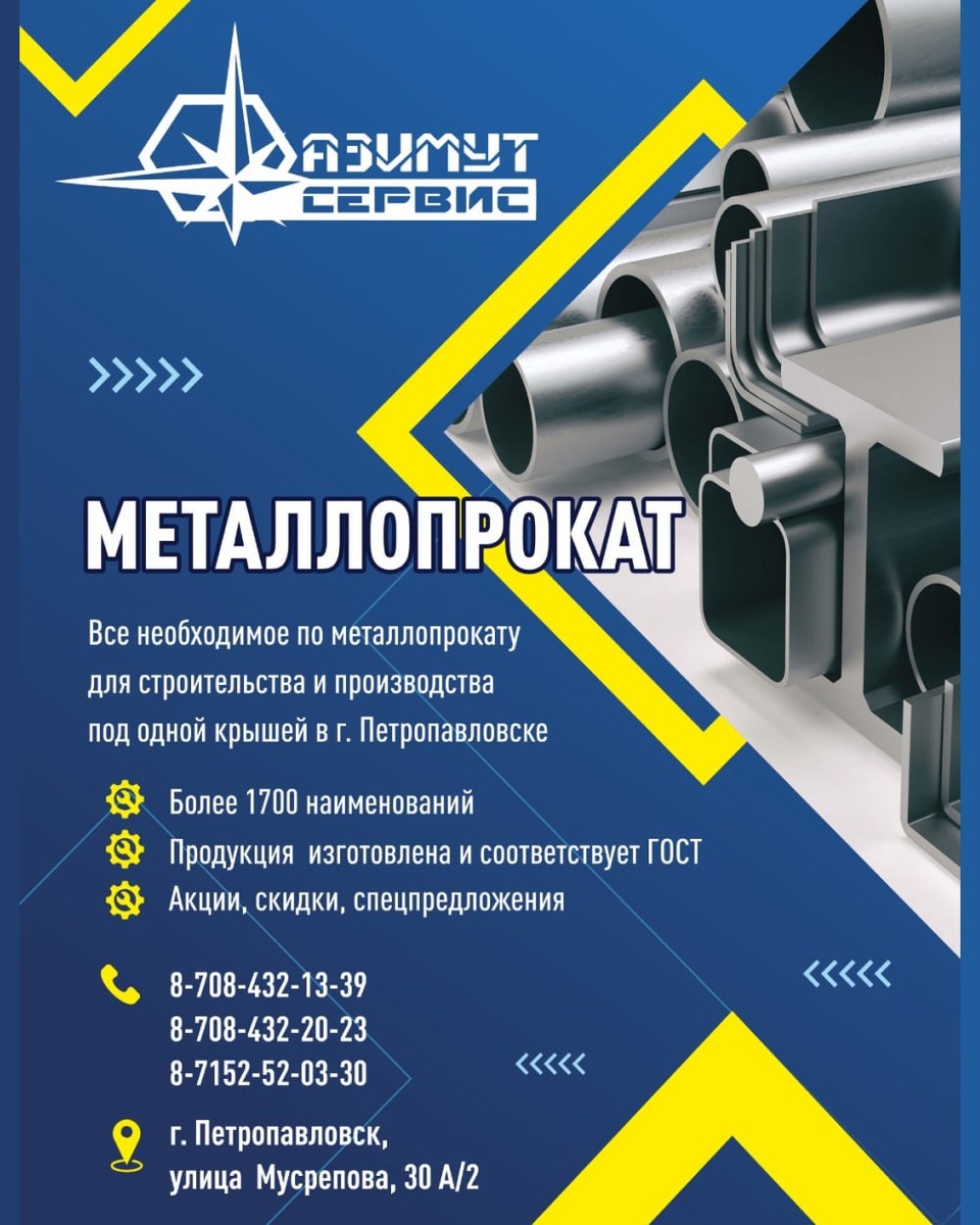 Все необходимое по металлопрокату для строительства и производства под одной крышей в г. Петропавловске ⦁ Более 1700 наименований ⦁ Продукция изготовлена и соответствует ГОСТ ⦁ Акции, скидки, спецпредложения 8-708-432-13-39 8-708-432-20-23 8-7152-52-03-30 г. Петропавловск, улица Мусрепова, 30 А/2