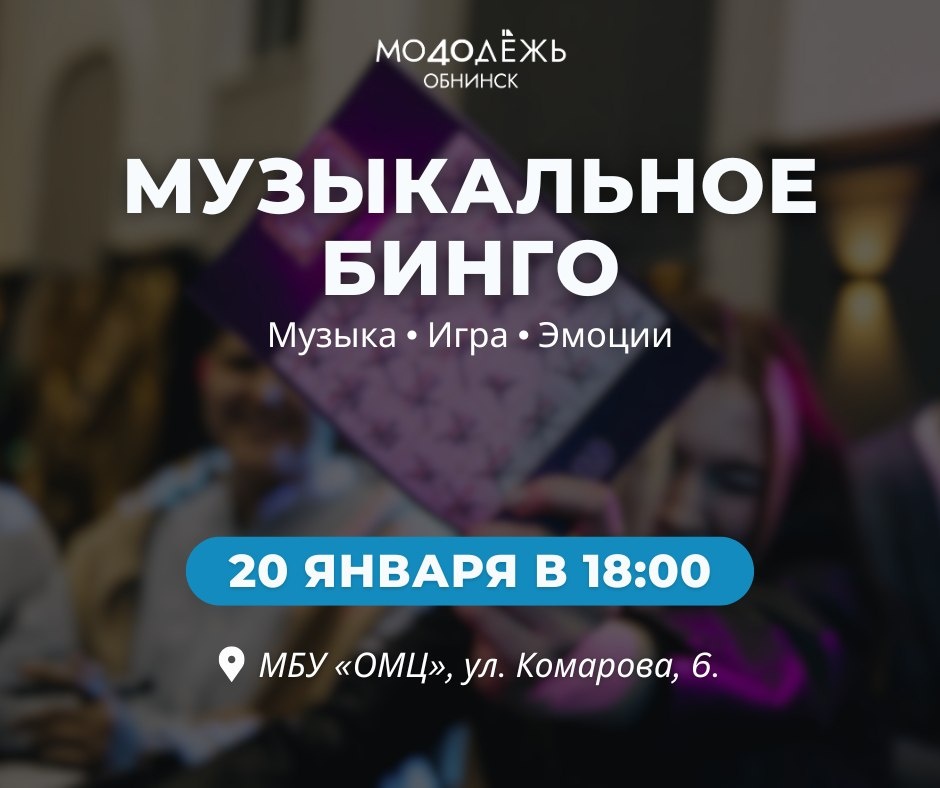 ? Тогда приходи СЕГОДНЯ на Музыкальное бинго в ОМЦ! 🕓 Дата и время: 20 января в 18:00 📍 Место: Место: МБУ "ОМЦ", ул. Комарова, 6, 2 этаж (центральный вход). Предварительная регистрация по ссылке: clck.ru/3RKbWN 👍 Подписаться | Ваша реклама