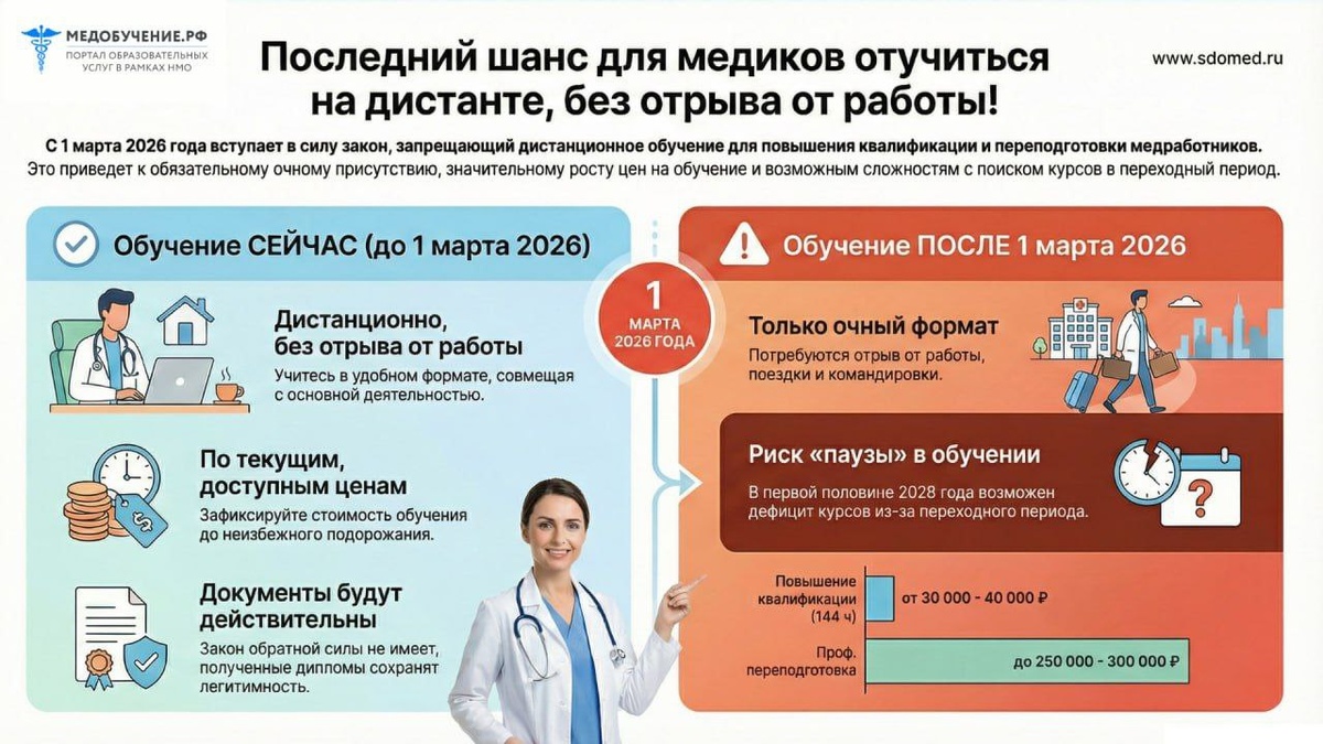 Последняя возможность медикам обучиться дистанционно Дорогие коллеги, как бы нам ни хотелось отложить этот разговор, он всё равно становится частью реальности. С 1 марта 2026 года дистанционный формат дополнительного профессионального образования закрывается, и это уже не обсуждение на уровне прогнозов, а конкретный срок, к которому приходится соотносить свои решения. Можно относиться к этому по-разному. Во многом идея очного обучения оправданна, особенно для тех направлений, где практика действительно принципиальна. Но повышение квалификации в привычной жизни врача чаще всего упирается в другое — время, деньги и невозможность выпасть из рабочего графика без потерь. ❗️Сейчас остаётся чуть больше месяца, когда эти вопросы ещё можно закрыть в дистанционном формате. Можно пройти обучение сразу на 144 часа и спокойно закрыть пятилетний цикл. Повышение квалификации 144 часа для врачей — 7 490 ₽ для медицинских сестёр — 6 490 ₽ Можно добрать необходимое количество часов частями, чтобы