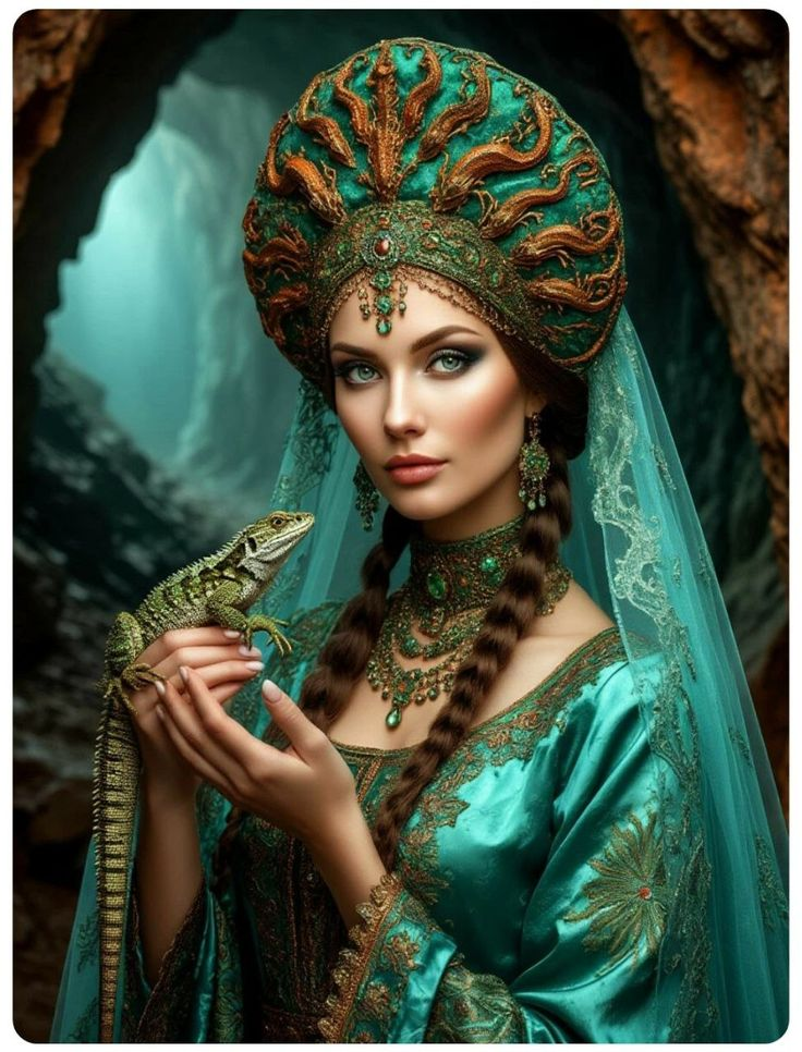 Хозяйка Медной горы из сказов Павла Бажова — это воплощение женского архетипа, которая хранит бесценные дары внутреннего мира: интуицию, творческий потенциал, скрытые силы души. Она не просто дух подземных недр, а мудрая страж, одаривающая ими тех, кто достоин, — мастеров, искателей, способных преобразовать дар в вечное творение. Ее образ учит: истинные сокровища рождаются в глубинах психики, и только чистое сердце может их извлечь. Внутренний мир женщины-Хозяйки — это бездонные пещеры души, полные малахита, самоцветов и тайн. Она аккумулирует энергии Инь: замедление, глубину, циклы рождения и угасания. Эти дары — не золото или камни, а неуловимые жемчужины психики: интуитивная мудрость, эмоциональная сила, способность к возрождению. Платье Хозяйки, меняющееся от стеклянного блеска до медного сияния, символизирует изменчивость этих сокровищ — сегодня они ослепительны, завтра скрыты в тени. Как Хранительница, она не растрачивает дары зря. В сказе камешки рассыпаются в пыль в руках не