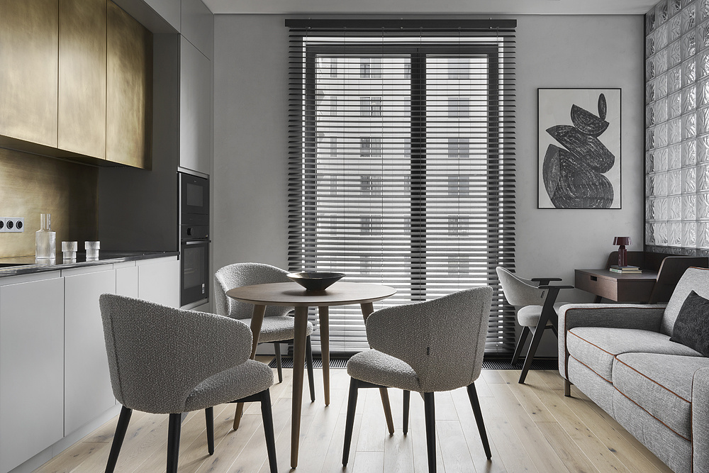 Интерьер этой небольшой квартиры в московском жилом комплексе «Диалог» создавался для молодого человека, который планирует жить здесь один. Смелый заказчик был открыт к экспериментам и предложениям дизайнера студии Точка дизайна. Хозяин согласовал лаконичную концепцию с первого раза, и работа закипела. Небольшой метраж квартиры требовал по-настоящему интересных приемов зонирования. Пространство решили не дробить на глухие комнаты, поэтому на помощь пришли светопрозрачные перегородки из стеклоблоков. Они визуально увеличили площадь и обеспечили целостность интерьера. Изначально на объекте были выделены только мокрые точки — вокруг них уже были возведены стены, которые пришлось корректировать. Дизайнер перенесла некоторые проходы, чтобы сделать сценарии движения более эргономичными. Залитую дневным светом половину дома команда отвела под объединенную кухню-гостиную и спальню, а в глубине помещения разместились санузлы, гардеробная и компактный хаммам. Характер заказчика как нельзя лучше