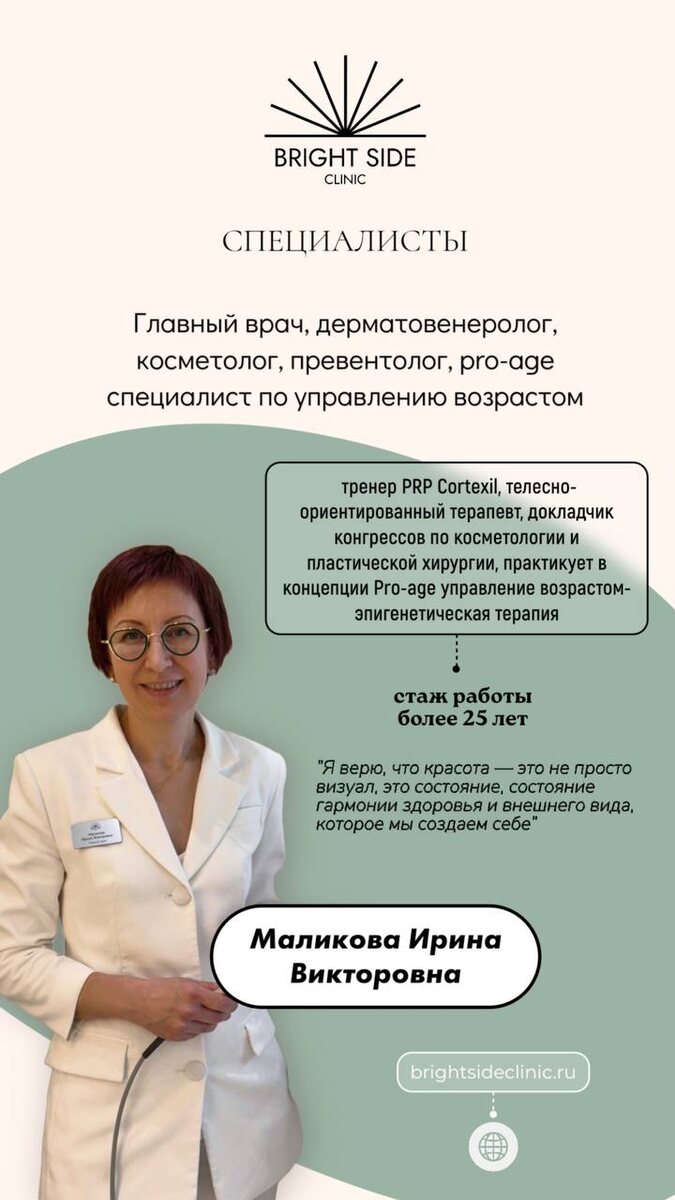 💚 В Bright Side Clinic мы подходим к эстетике как к части здоровья. Для нас важно, чтобы за каждым результатом стояли опыт, системное мышление и индивидуальный план — а не набор процедур. Именно поэтому в клинике работает команда специалистов с разным клиническим фокусом, но с общей философией: доказательная медицина, превентивный подход и уважение к естественности. 👩⚕️ Маликова Ирина Викторовна Главный врач клиники, врач превентивной медицины, дерматовенеролог, косметолог, pro-age специалист с более чем 25-летним стажем. Её подход — управление возрастом через здоровье, эпигенетику и системную работу с организмом. Когда эстетика становится продолжением заботы о качестве жизни. 👩⚕️ Стафеева Надежда Александровна Врач-дерматовенеролог, косметолог, трихолог с 11-летним клиническим опытом. Соединяет дерматологию, косметологию и трихологию в едином системном подходе — для тех, кому важны не только внешний вид, но и внутренний баланс. 👩⚕️ Леонтьева Наталья Юрьевна Косметолог-эсте