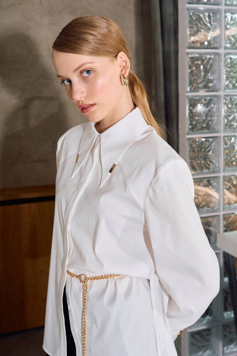 % Белая рубашка с золотым металлическим акцентным декором станет великолепным дополнением к гардеробу. Создана для тех, кто любит классику с изыском🤍 ❤️В комплектацию входит металлический золотой пояс с застежкой на фиксатор. Состав: хлопок 95%, эластан 5% Стоимость со скидкой: 4 995₽ Размеры: 46,48