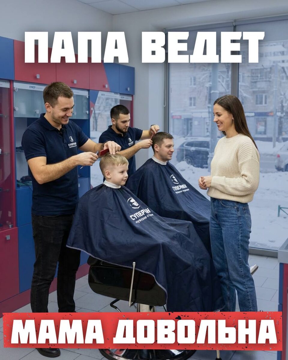 Когда папа берёт сына с собой на стрижку, маме спокойно — у ребёнка аккуратная причёска и хорошее настроение 💈 А по средам ещё и выгодно: ✂️ акция «Отец и сын» — 2 стрижки за 1100 ₽ Приходите вместе — семейные походы в «Супермен» всегда кстати 💙
