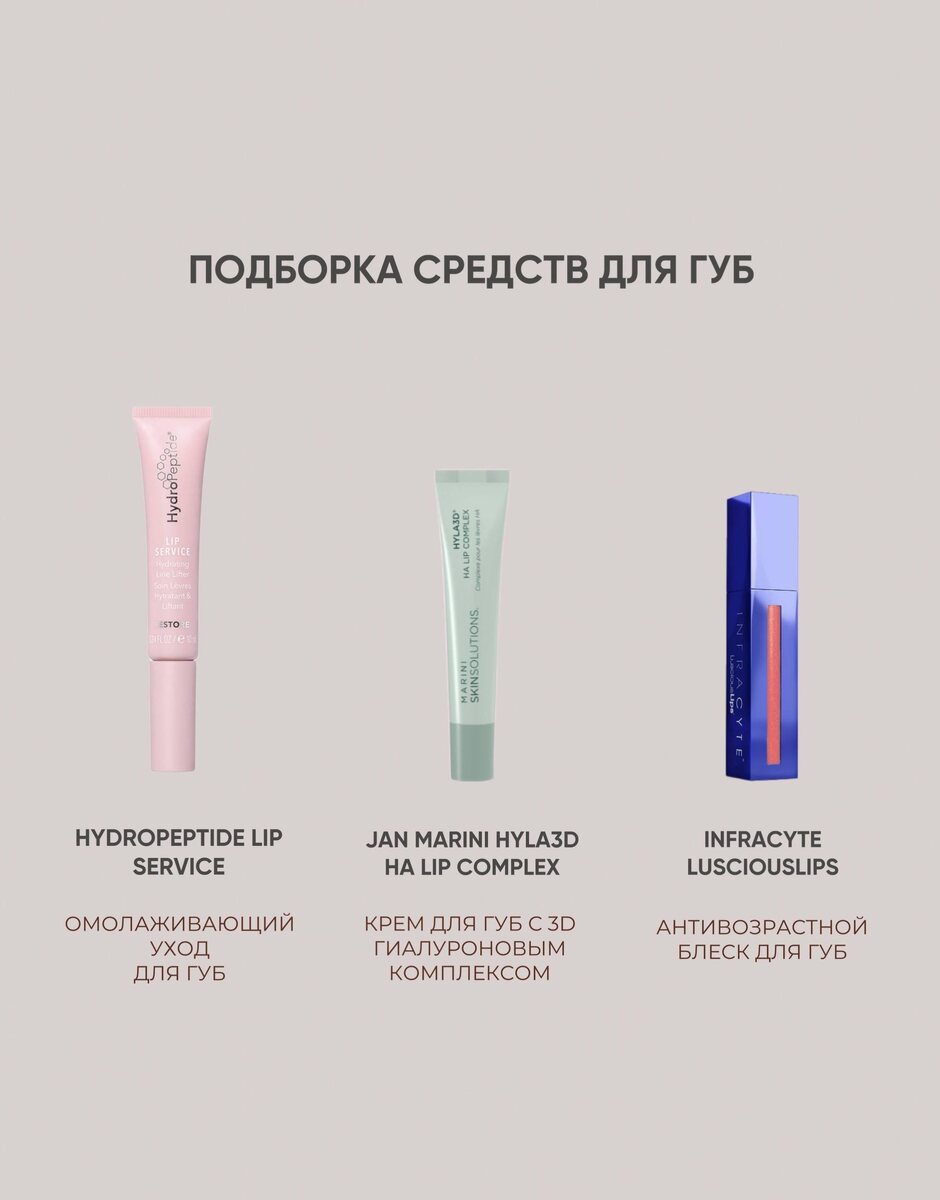 : HYDROPEPTIDE LIP SERVICE ОМОЛАЖИВАЮЩИЙ СЕРВИС-УХОД ДЛЯ ГУБ - имеет анти-возрастные свойства, восстанавливает объем губ, их гладкость и наполненность, предупреждает преждевременные признаки старения, увлажняет и улучшает микроциркуляцию JAN MARINI HYLA3D HA LIP COMPLEX КРЕМ ДЛЯ ГУБ С 3D ГИАЛУРОНОВЫМ КОМПЛЕКСОМ - трехмерный подход к восстановлению увлажнения, одновременно уменьшая проявление мелких и глубоких морщин и возвращая губам их природную молодость INFRACYTE АНТИВОЗРАСТНОЙ БЛЕСК ДЛЯ ГУБ LUSCIOUSLIPS - уменьшает появление складок для губ и тонких линий вокруг рта, улучшает и продлевает результат инъекций губ наполнителем гиалуроновой кислоты