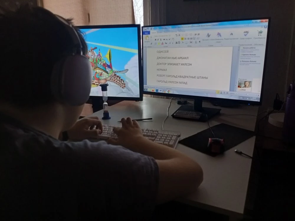 Вот Гриша самостоятельно делает "Гарри" (читает и отвечает на вопросы, в приложении на компьютере). Иногда вечером, когда он ещё не доделал Гарри, потому что теперь это полностью его ответственность, я подхожу и начинаю помогать (пинать), мотивировать, мол, давай быстро сделаем, а то уже ночь. Гриша соглашается, но через три-четыре вопроса просит меня уйти и делает сам. Хотя со мной, очевидно, и проще (?) и быстрее.