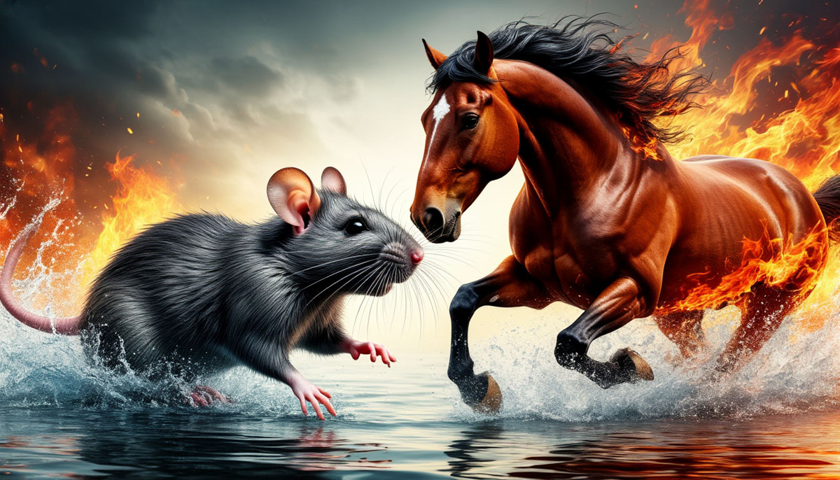 В китайской астрологии столкновение - одно из самых мощных взаимодействий, возникающее между животными, находящимися в прямой оппозиции в зодиакальном круге. Крыса (子) и Лошадь (午) расположены строго напротив друг друга, формируя ось Север - Юг, что создаёт динамику резких перемен и разрешения накопившихся противоречий.