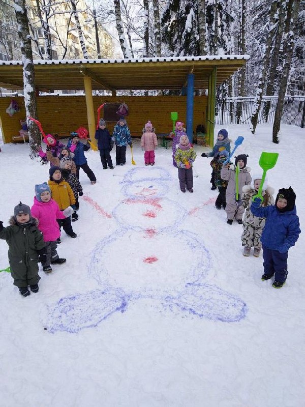 Фотофакт: воспитанники детского сада в 8-м микрорайоне во время прогулки нарисовали на снегу огромного снеговика