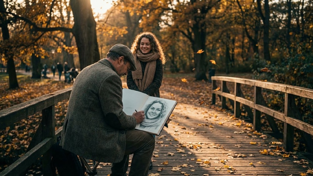 Осенний портрет на улице (Urban Storytelling) Когда хочется создать не просто красивую осеннюю сцену, а историю с душой, вниманием к деталям и почти магическим реализмом. Этот промпт — формула для кадра, где главный фокус на невероятном сходстве рисунка и модели, что является высшим пилотажем для нейросети. 🔑 Ключ (Prompt): Ультрареалистичная фотография, золотая осень, солнечный день. Пешеходный мост в парке, усыпанный желтыми листьями. Мужчина-художник лет 45, сосредоточенно дорисовывает детали портрета в альбоме. Напротив позирует улыбающаяся девушка. КРИТИЧЕСКАЯ ДЕТАЛЬ: почти законченный карандашный портрет в альбоме фотографически точен и идентичен лицу девушки, идеальное сходство. Теплое боковое освещение сквозь листву, золотистая атмосфера, летящие листья. Глубина резкости малая, фокус на руке художника и портрете. Снято на Leica M11 с объективом 50mm f/1.4, стиль уличной фотографии. --ar 4:5 --style raw --stylize 160 🎯 Что он открывает: * Вызов нейросети: Фраза «портрет ф
