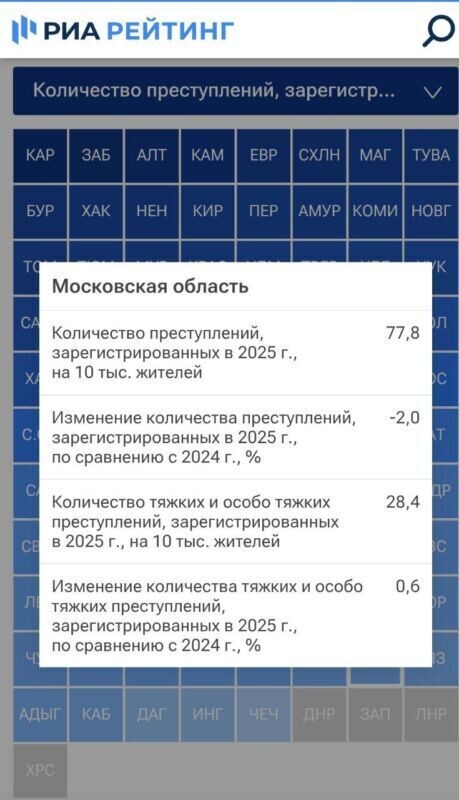 В 2025 году в среднем на 10 тысяч жителей Подмосковья приходилось 77,8 преступлений. За год уровень преступности снизился на два пункта, однако количество тяжких преступлений возросло. Наиболее безопасной для жизни среди регионов остаётся Чечня. Наибольшее количество преступлений фиксируется в Карелии. 🏙Подмосковье - актуальные новости