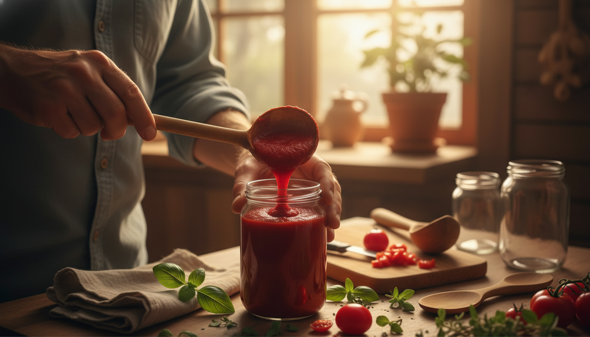 Есть и сезонные нюансы. В дождливое лето попадаются watery томаты, такие требуют или более долгой варки, или дополнительных приёмов. Мы тогда делаем двойное отсевание через сито, сначала протираем, затем даём постоять десять минут, снимаем сверху чистый сок половником, возвращаем густую часть на огонь и снова помешиваем. Иногда помогает духовка, так стабильнее и равномернее уходит лишняя влага. В жаркий год, когда сахаристость выше, уксус можно ставить меньше, вкус и так округлый, но я всё равно держу этот шаг как страховку для заготовок не под холодильник. На севере знакомые больше практикуют заморозку. Перебили блендером без варки, разлили по формочкам для льда, заморозили, сложили в пакет и дальше по необходимости по кубику в соус или подливку. Такой способ хорош, когда хочется сохранить свежий оттенок вкуса и не тратить время на стерилизацию.